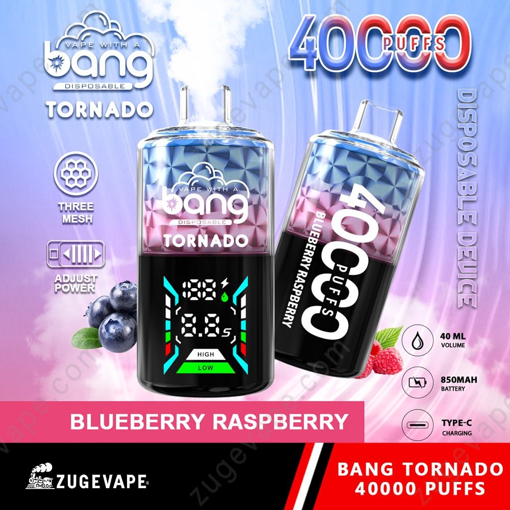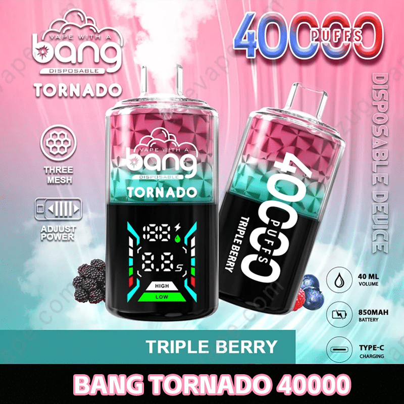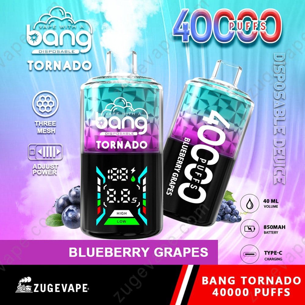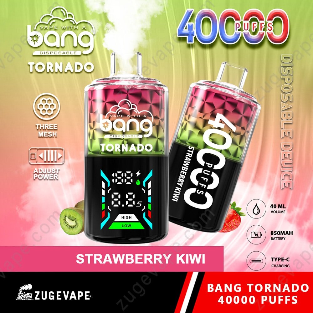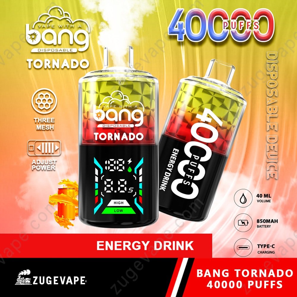 Get the Bang Tornado 40000 Puffs Disposable Vape with 40mL e-liquid, dual mesh coil, 850mAh battery, and 12 bold flavors. Perfect for wholesale and resellers.