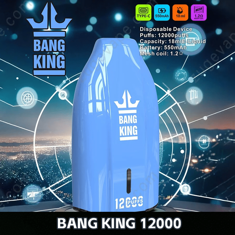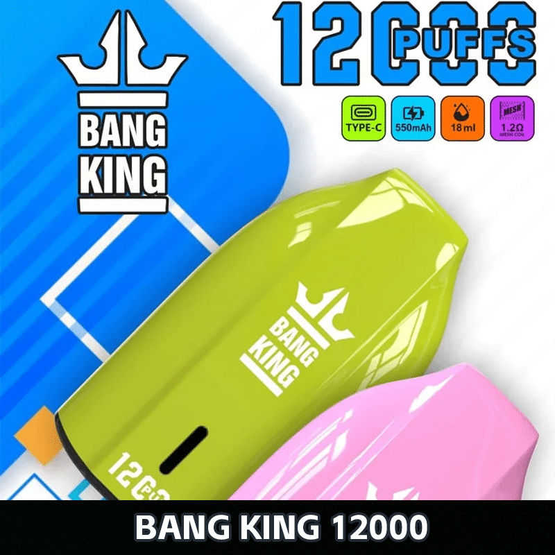 Experience the Bang King 12000 Porsche Puffs with 18ml e-liquid, 550mAh rechargeable battery, mesh coil, and 12 bold flavors. Long-lasting and portable.
